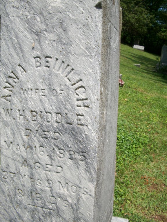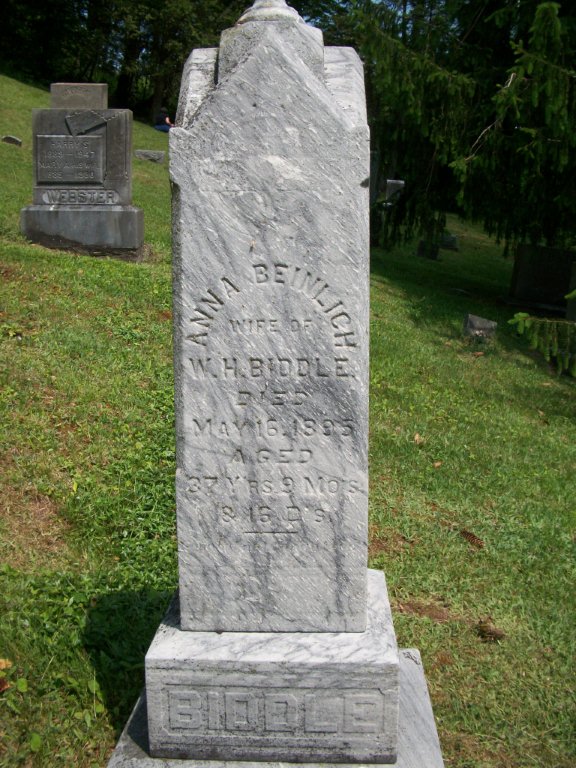 | Biddle, Anna Beinlich | May 16, 1895 | Wife of W. H. Biddle. Age 37yr 9mo 16d | |