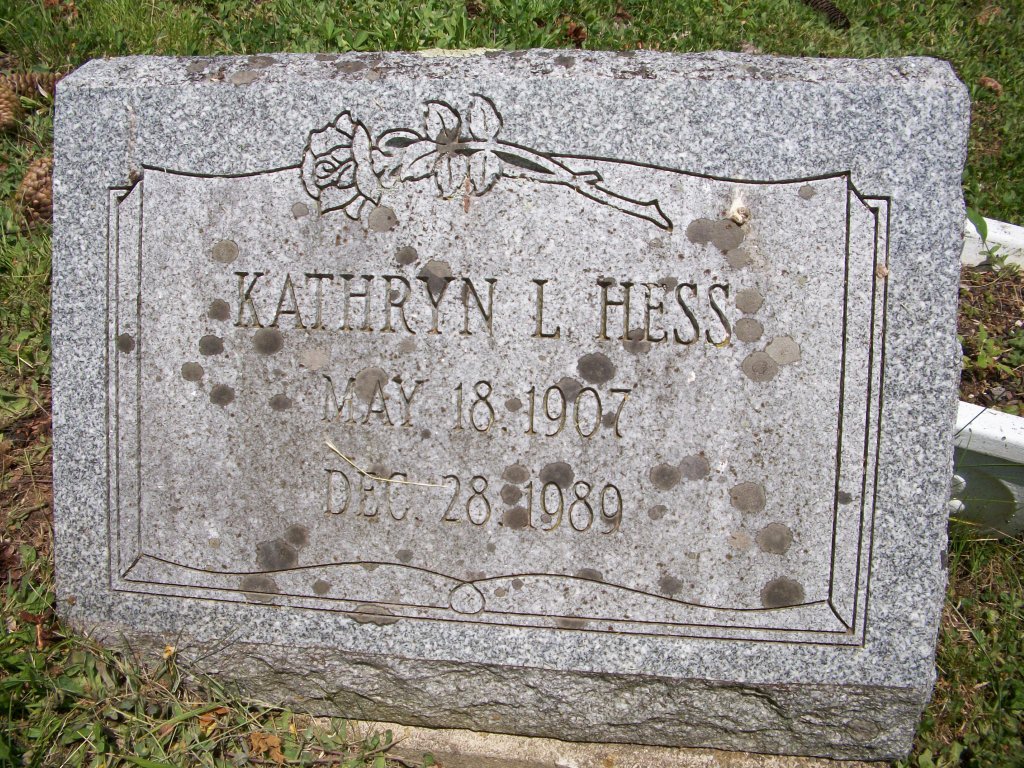 | Hess, Kathryn L. | 5/18/1907 | 12/28/1989 | Quote on back of stone: "Our nurse Nightingale Miss Hess R. N." |
