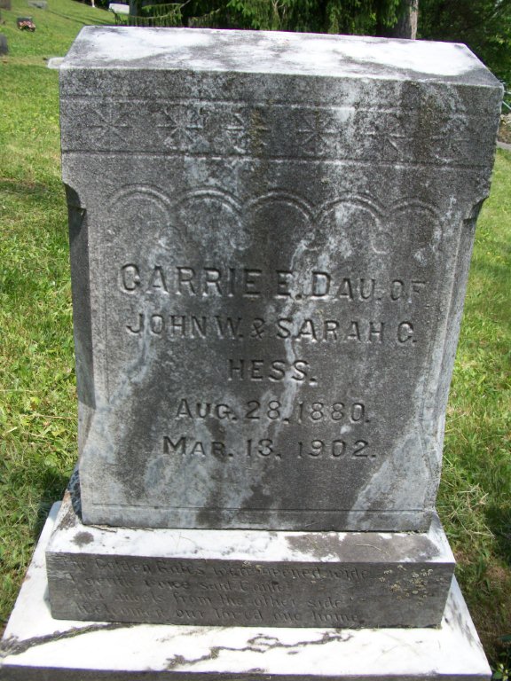 | Hess, Carrie E. | 8/28/1880 | 3/13/1902 | Dau of John W. & Sarah C. |