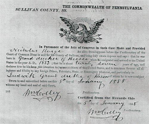 Frank, also nicknamed "Skinny", Hunsinger married Mary Suber June 2, 1911. Their children were: Mary Ellen, born March 28, 1912, married Robert Heath, Sr. Gilbert and Cora Elizabeth Hunsinger Pedro had the following children: Margaret Emma Pedro Sysock Pastusic, born October 16, 1931 Alberta Mary Pedro married Francis Pastusic on June 29, 1963. Their children are: Tina Marie Pastusic, born April 25, 1964 (our contributor) Here are some other items of interest that Bob Sweeney found during his survey of the Orphans Court records in the Sullivan County Courthouse at Laporte, PA. Dick Hunsinger, the Treasurer of the Huntzinger/Hunsinger Family Association, reviewed and explained some of these records as indicated below. Dick maintains a database of 14, 000 names on the Hunsingers and related families. He lives east of Reading, PA in Berks County, but has another home in Bradford County between Bentley Creek and Wellsburg, so he travels through and is familiar with Sullivan County on a regular basis. Here are several of these additional pieces of information: (2) The will of Martin Luther Hunsinger of Cherry, dated October 18, 1881: Martin was the son of Jacob and Elizabeth ______ Hunsinger, and therefore the grandson of Bernard and Eva Margaretha Reich Hunsinger. Martin died August 27, 1881 and left his estate to his wife Sarah (nee Santee) and son Amandus ("Manda"). It was not clear where this man fit into the Hunsinger lineage, but Dick Hunsinger cleared it up for us. (3) The will of L.B. (for for Levi Benjamin) Hunsinger of Cherry, PA dated November 11, 1888: He left estate to son Porter Wilson Hunsinger (July 1, 1854-January 9, 1937). Dick Hunsinger also confirmed this record. (4) Emigration to New York: June 1853: Nicholas Karge, born in province of Hesse, Germany in 1831 and was granted naturalization papers September 3, 1861. Copies of his declaration of intent to be come a citizen (1858) and petition for naturalization in 1861 are shown below. (5) Really old stuff: (a) June 7, 1849: a petition to the Orphans court by a Levi Hunsinger. (b) 1855: court allows petition of son to sell land of Peter and George Hunsinger (150 acres) presumably because they have died intestate and estates must be settled.