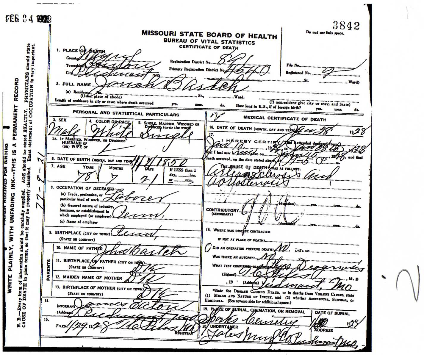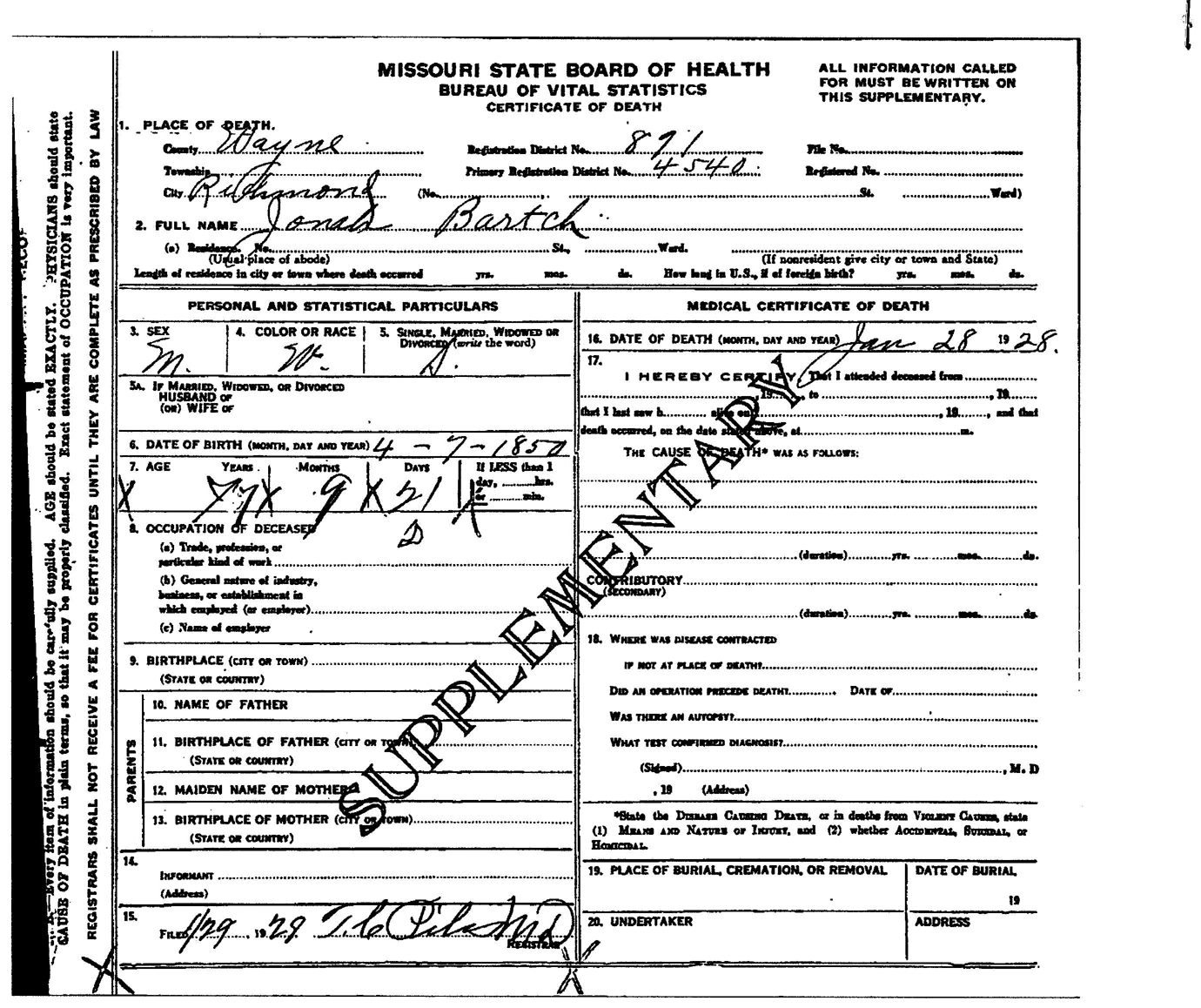 Jonah Bartch 1850-1928 Death Certificate Wayne County, MO