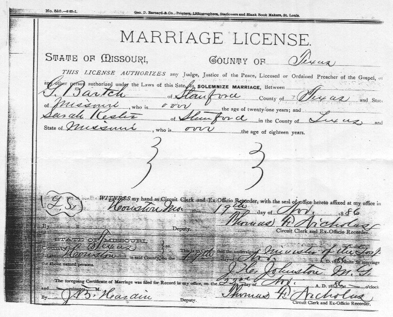 When I saw the Bartch/Kester marriage certificate you referred me to, it looked very familiar. I checked my files and found a copy with my note that I obtained it on Aug 23, 1991 at the Texas County Courthouse in Houston, MO. I won't trust my memory anymore! Are there any descendants from the son of Bartch/Kester living in MO that you know of?