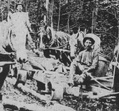 are made of tree trunks. The wheels have no tires. The picture shows lumbermen hauling cut logs out of the woods using this unique method.
