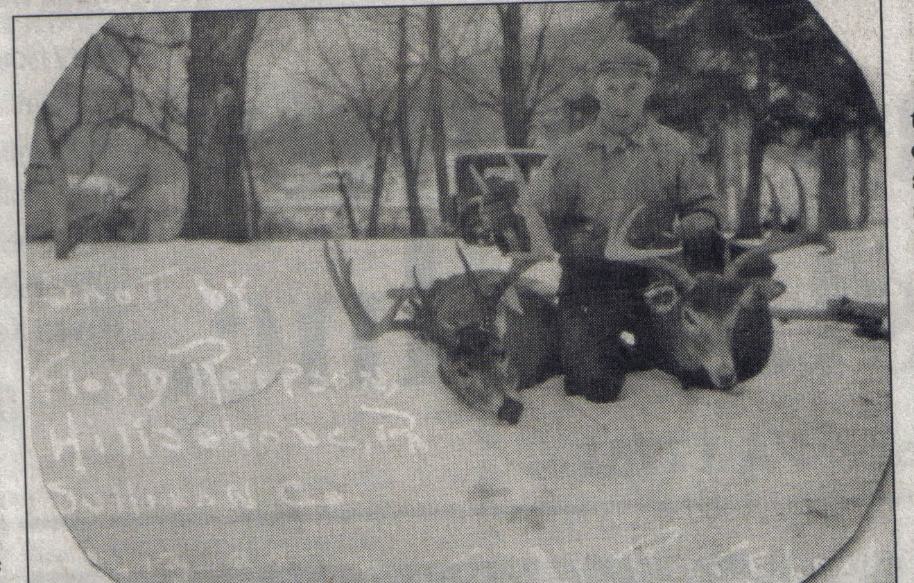 Original Photo Taken in 1932 Reprinted in the December 1, 2005 Issue of the Sullivan Review. The caption under the reprint reads: "Floyd Reibson, late of Hillsgrove, shot these bucks Dec. 1932 in Hillsgrove Twp. The one held the state record until just a few years ago. The photo was taken by Bob Latimer, the first game warden in Sullivan County. Floyd was a brother of Maynard, Vernon, and Lester Reibson; and of Sara Blass, Louella Miner and Eleanor Bodeck."