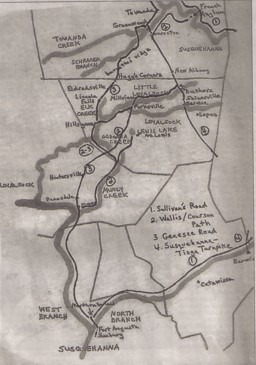 Trails in Northern Pennsylvania In the area that would eventually become Bradford, Sullivan and Lycoming Counties and surrounding areas Source: David Bailey Reprinted in the March 1, 2007 issue of the Sullivan Review