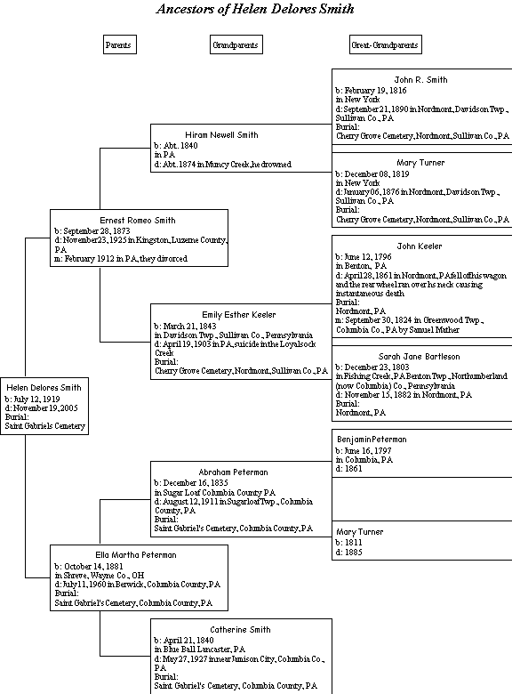 My name is Helen Smith Gammon, I am 85 years old, still a Pennsylvania a resident but spend winters in Chandler, Arizona, about 5 miles from the Mesa Family History Center where I found tons and tons of information. I might as well tell you now I have metastasized breast cancer and am not sure of the future or how much longer I�ll be able to do genealogy. You can keep me in your prayers if you wish.