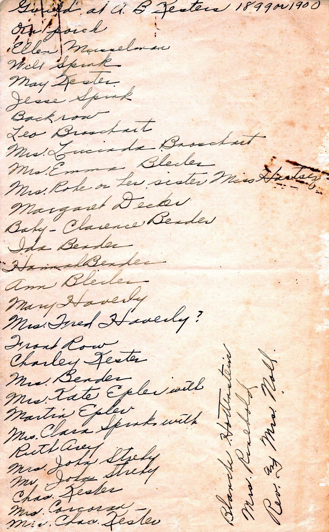 C. Musselman, b. 1858, who m. Gilbert L. Rinebold), Mrs. (?) Noll and Rev. Knoll.