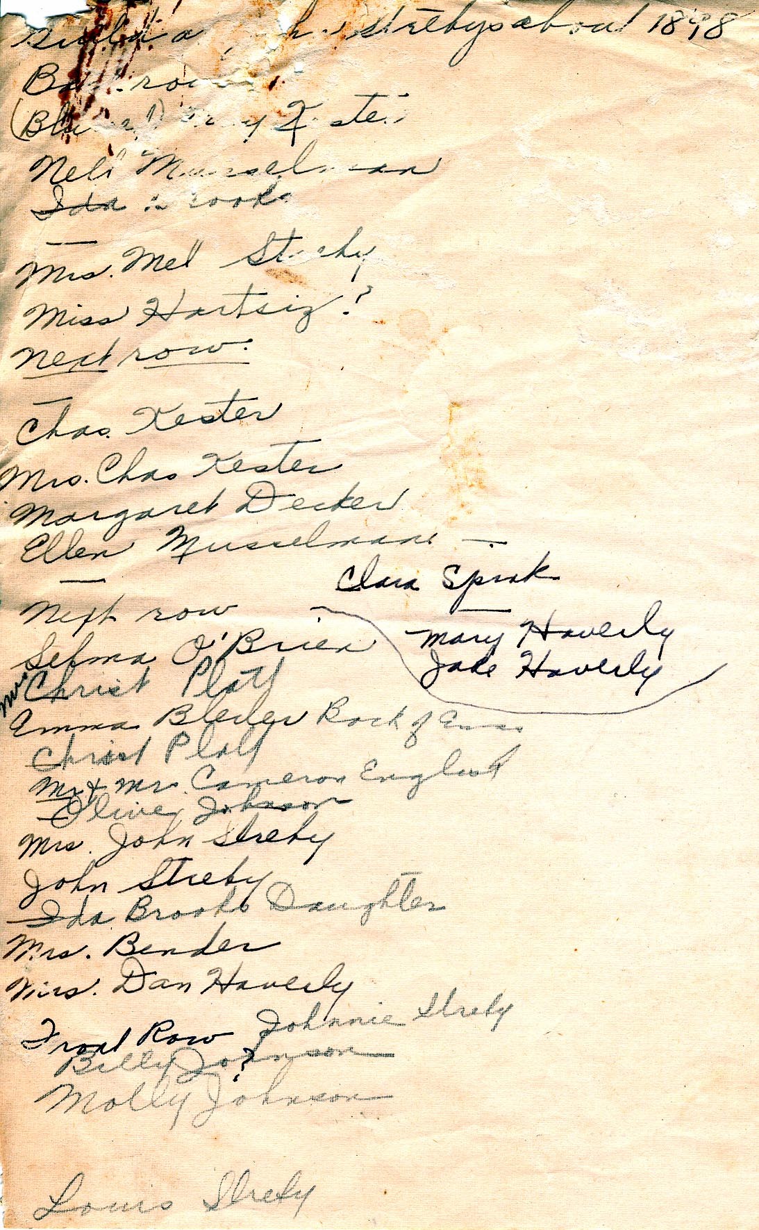 Back Row: (L-R): (Blurred) May Musselman (Mrs. Alf Kester), Nell (Mathews) Musselman (Mrs. Geo O.?), Ida (?) Brooks,