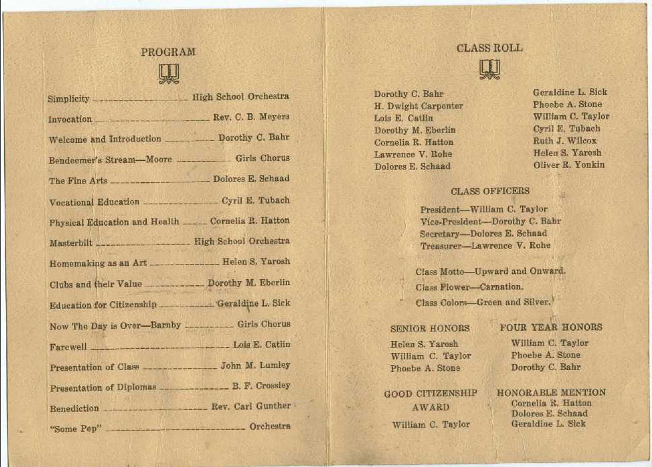 The alumni from the years 1898 through 1937 are in this text.  The original booklet actually goes to the year 1953.  However, because many alumni are  still living, I will not share the years 1941 through 1953 publicly.  I would be more then happy to do look ups for the years not shown.  Interested readers can contact me at the e-mail address linked to my name above.