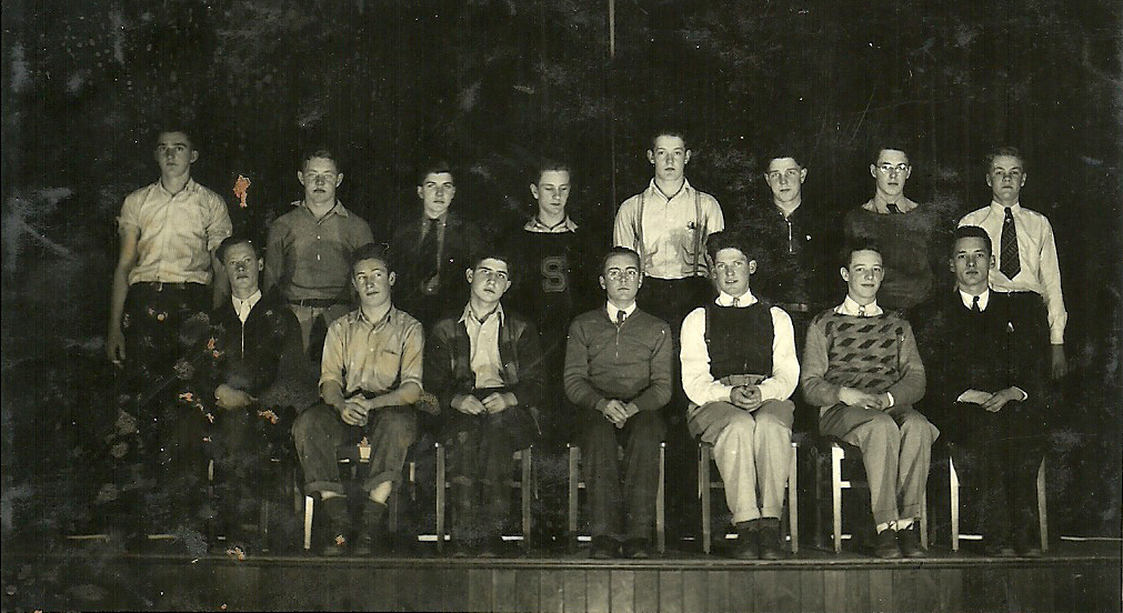 I have also inserted some other photos from my father's photo albums at various points below. Interested readers can contact me at the e-mail address linked to my name above for further discussion. Here is a photo of my dad in second grade in 1928. He is in the third row, fifth from the right. He attended the one room school house between Sonestown and Nordmont.
