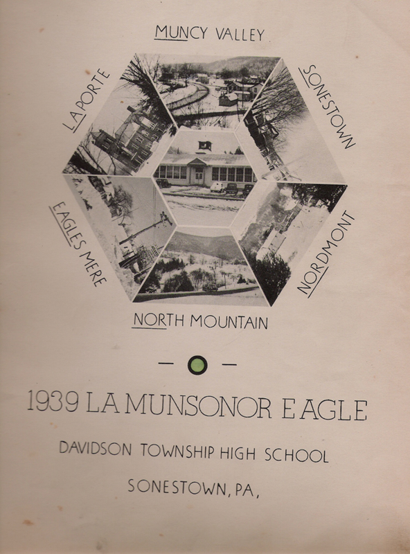 The following information come from the La Munsonor Eagle, 1939 issue of the local high school yearbook. This copy belonged to my father, Walter Richard King. In 1937, it was known as Sonestown High School, Sonestown,Pa. In 1938 the school was enlarged. In the 1939 book, Vol.V, the title says Davidson Township High School, Sonestown,Pa. I assume the school was consolidated to become a township school. The service draw areas of Muncy Valley, Laporte, Sonestown, Eagles Mere,North Mountain and Nordmont are noted on the first page.