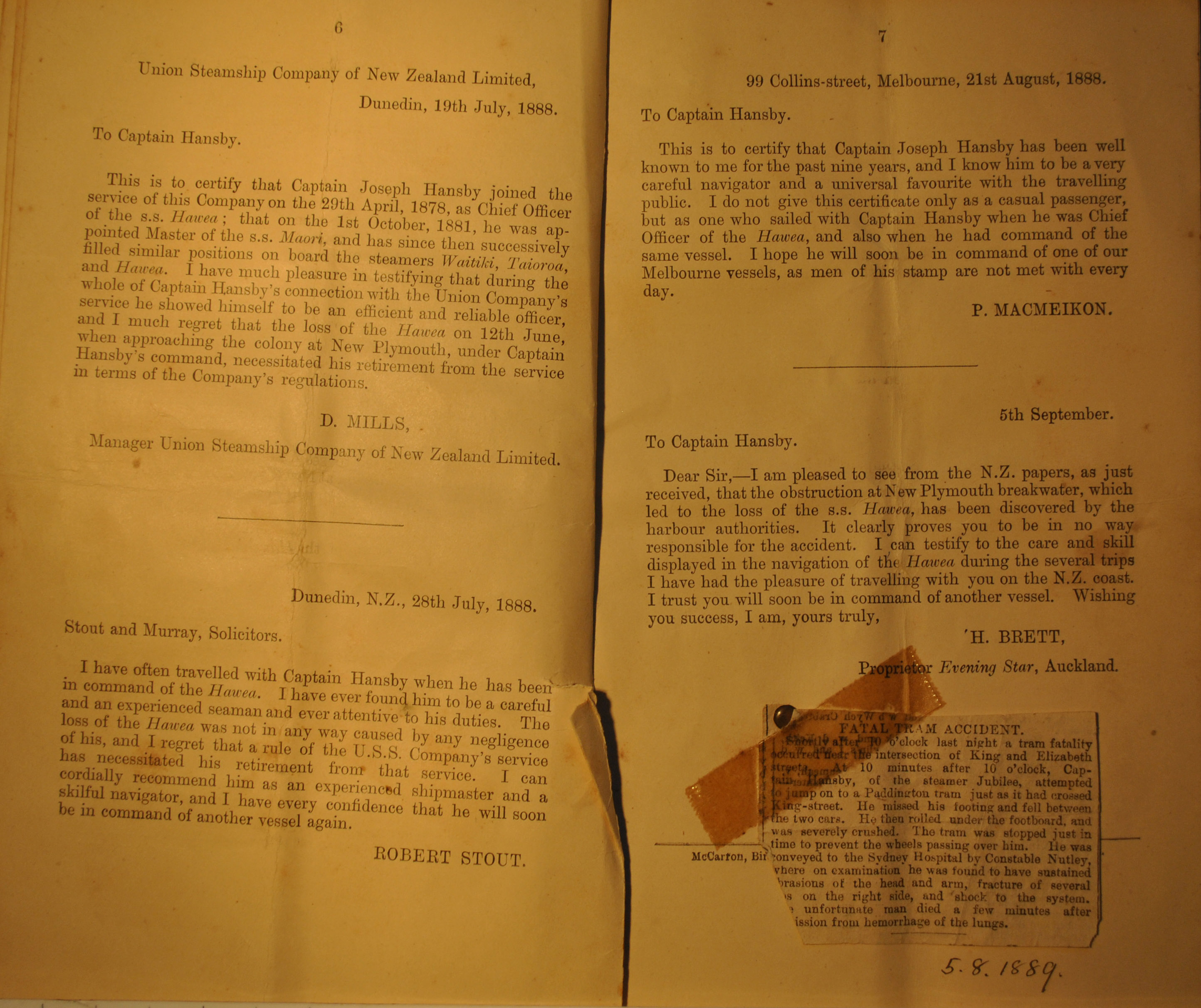in Australia. There is also an old newspaper clipping describing his fatal accident. These documents were preserved by David's mother,